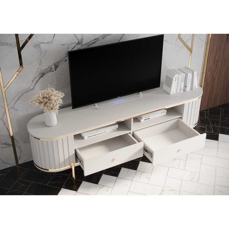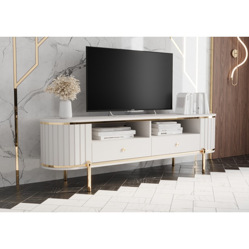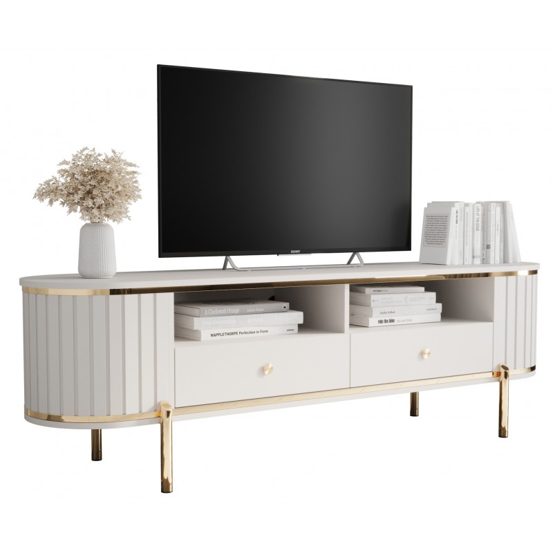 Meble NEW YORK to kolekcja nowoczesnych mebli z zaokrąglonymi bokami w której w skład wchodzą komody i szafki RTV w dwóch rozmiarach do wyboru. Tył mebli wykonany został z płyty laminowanej, dzięki temu można ustawić je w dowolnym miejscu w salonie - zarówno na środku, jak i pod ścianą.